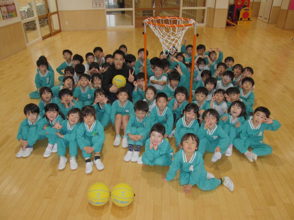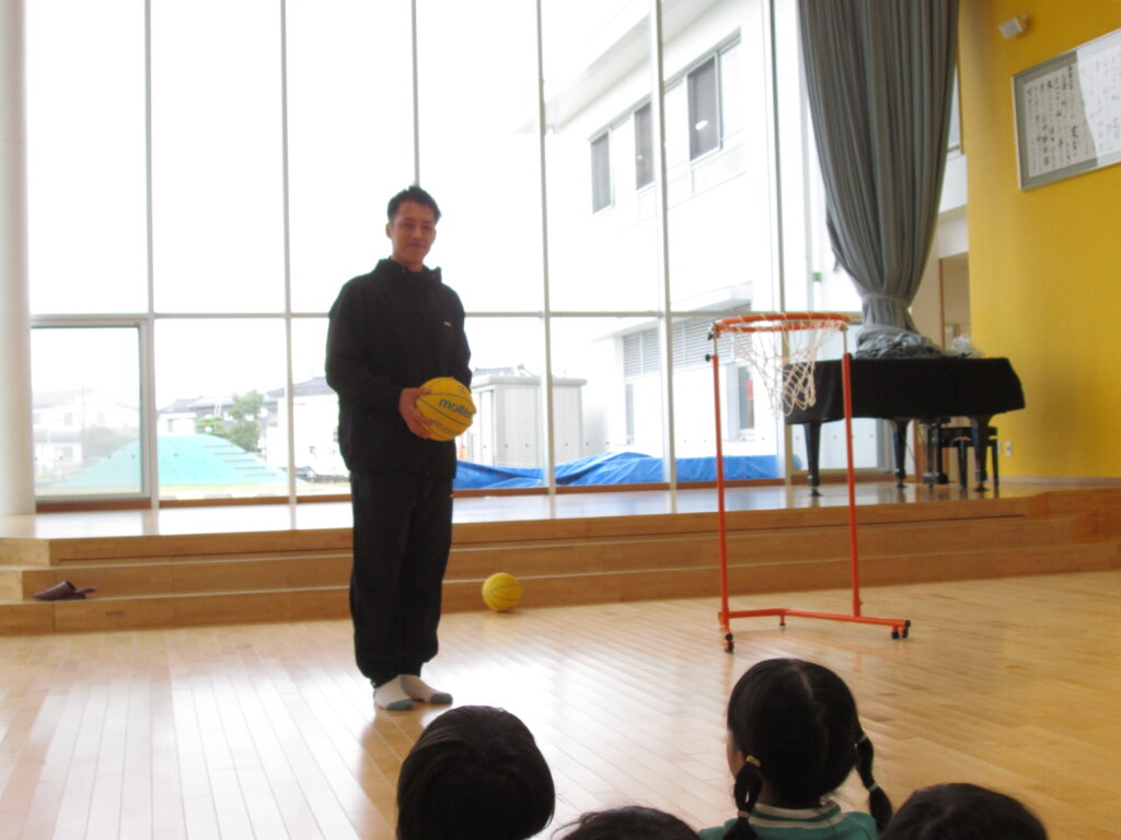 「バスケットボールって知っているかな?」という質問に、「やったことある!」「見たことあるよ」などたくさんの声があがり、バスケットゴールに興味津々な子どもたち。