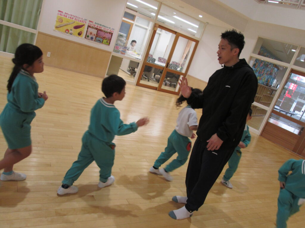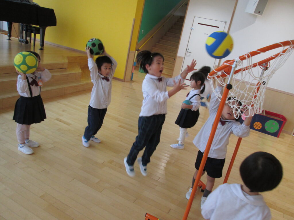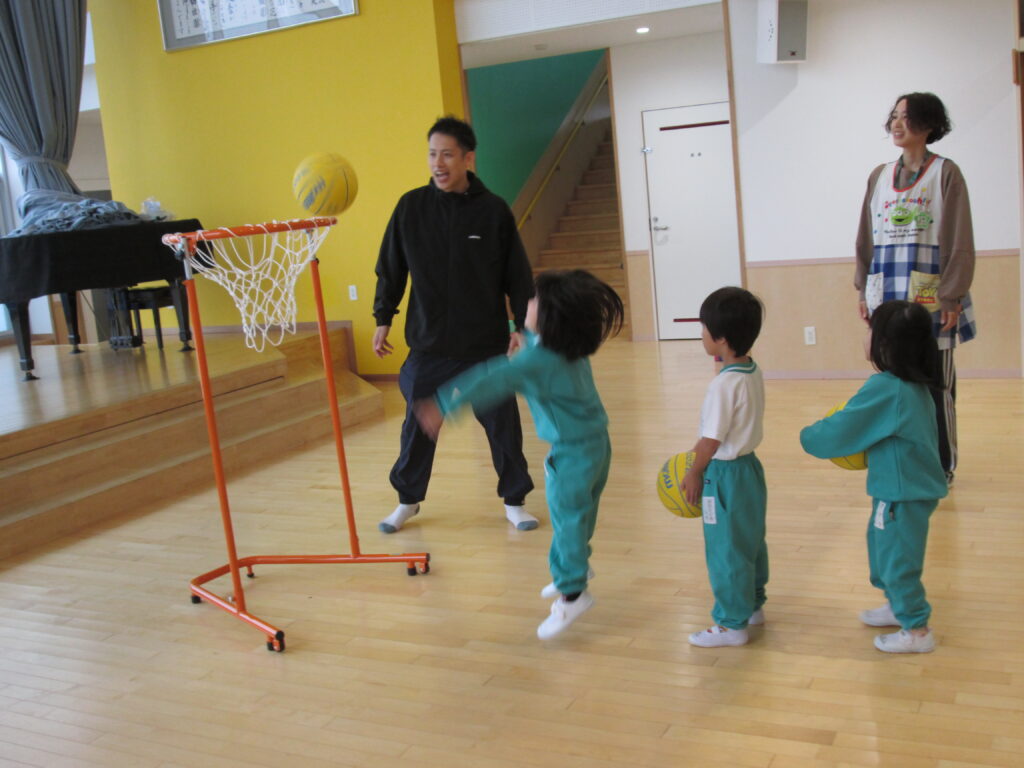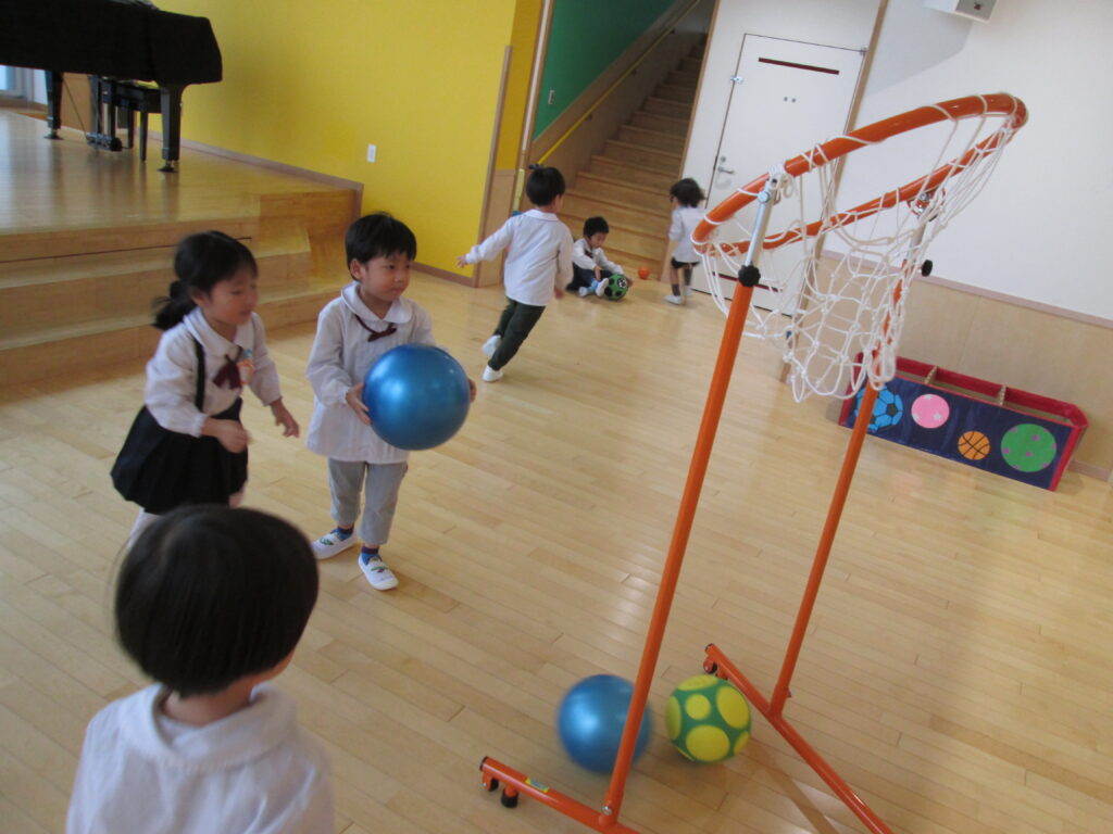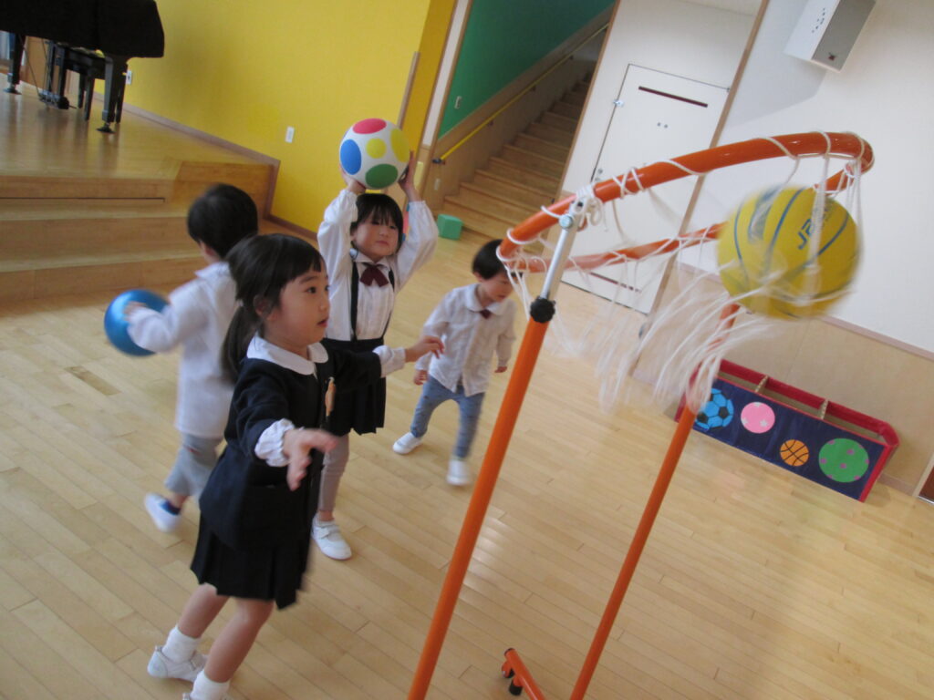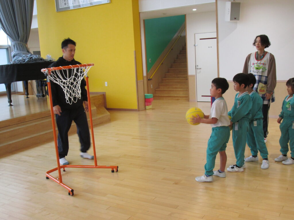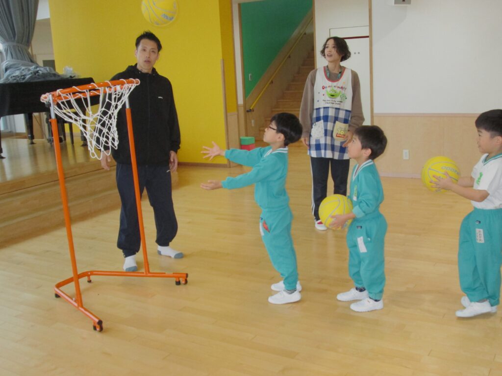 実際にボールをゴールに入れるところやドリブルを見せていただいた後、その日のお当番さんがボールをゴールにいれることに挑戦してみました🏀