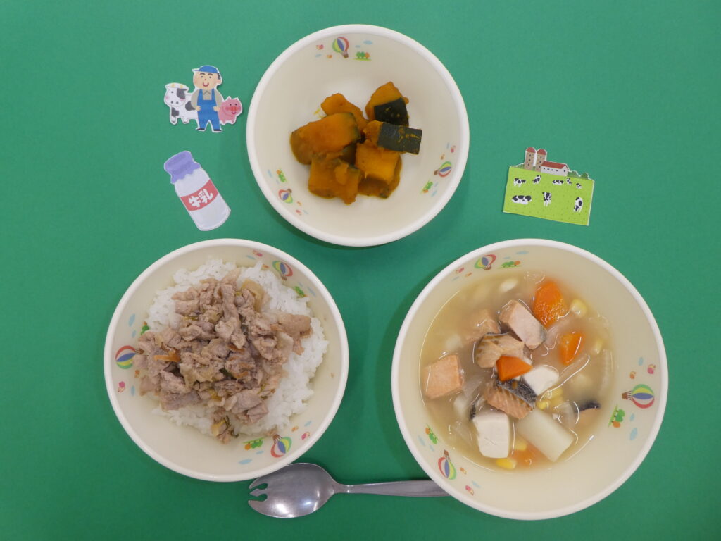 1月 給食〈日本の郷土料理🗾~北海道~〉 掲載日:2026年01月29日 メニュー🍴 豚丼 石狩汁 かぼちゃの甘煮 石狩汁は、鮭と野菜を煮込んで、味噌で味をつけた具だくさんの汁ものです。名前の由来は、鮭が産卵のために遡上する石狩川にちなんでいます。 具だくさんでボリューム満点!おいしかったね😋 前の記事へ